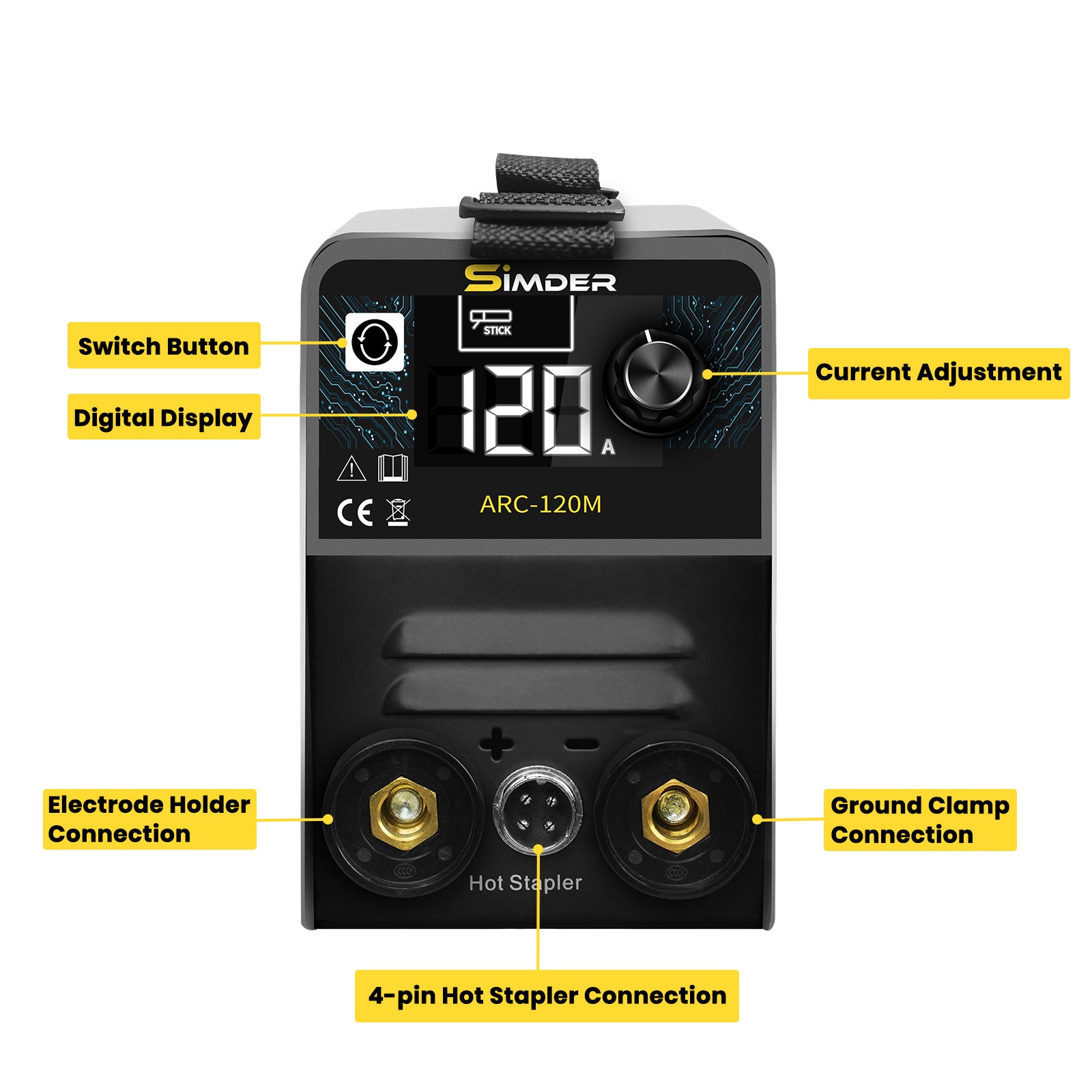 L'ARC-120M è una saldatrice versatile che combina la saldatura ad elettrodo e la saldatura della plastica in un'unica unità compatta.